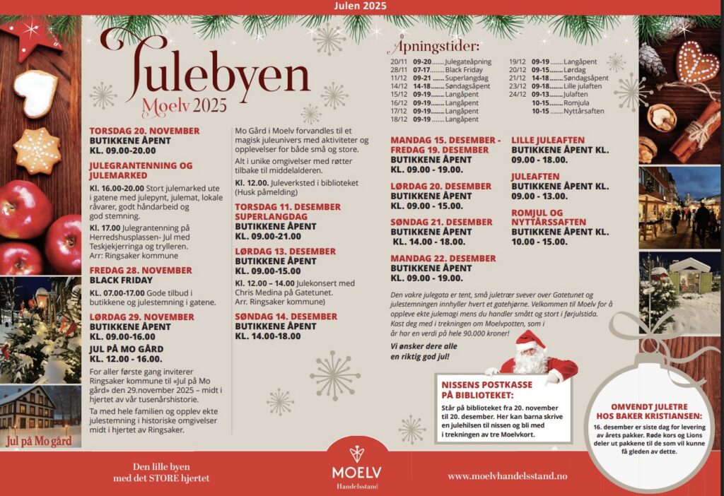Julebyen Moelv ønsker alle hjertelig velkommen til julehandel i den lille byen med det store hjerte! Det starter med langdag og julegrantenning torsdag den 21.november før vi avslutter en hektisk julehandel med trekningen av…